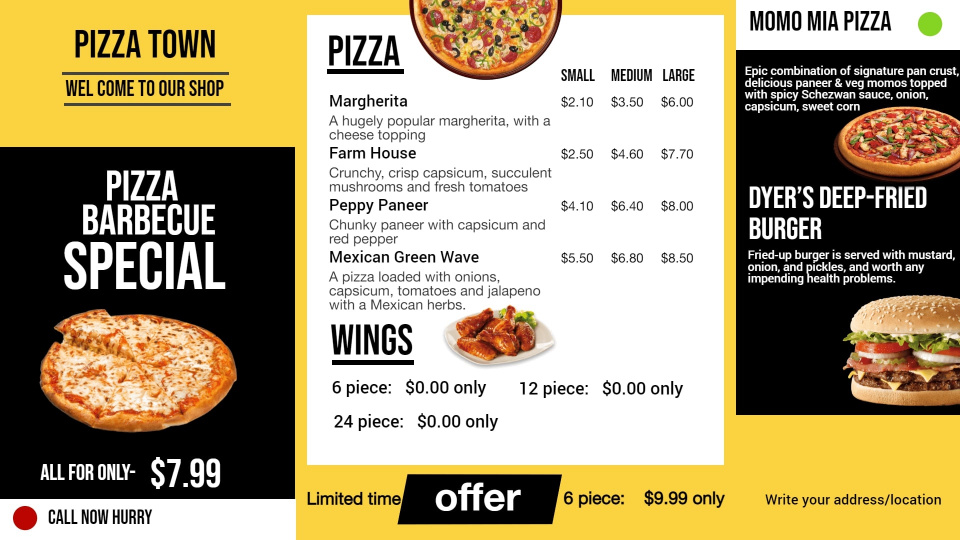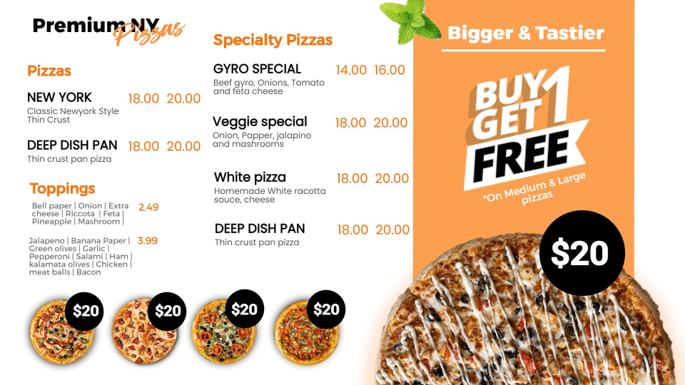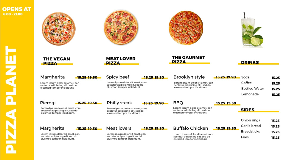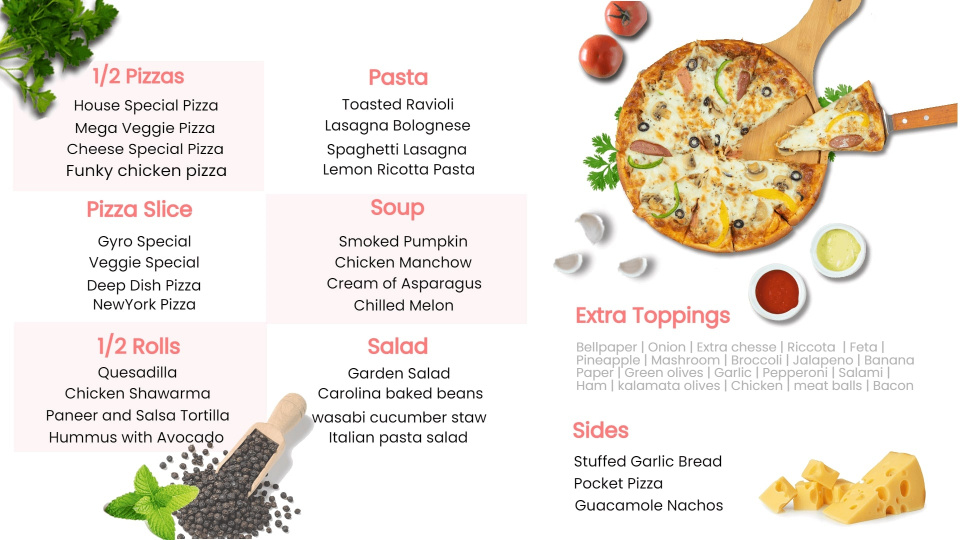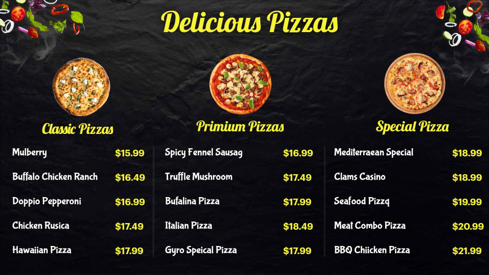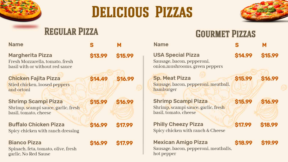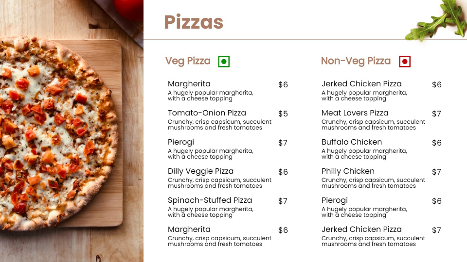 Cheesy, mouth-watering and everyone’s favourite - Pizzas need no introduction but they surely need a great menu template to get your more orders.